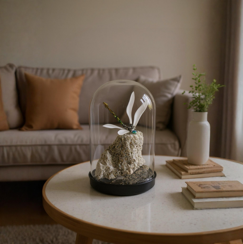 Ez a különleges lakberendezési alkotás a természet szépségét hozza el otthonába. A kézzel készült szitakötő finoman kidolgozott részleteivel és letisztult formavilágával a könnyedséget és az eleganciát szimbolizálja. Az organikus kő talapzaton elhelyezett kompozíciót egy áttetsző üvegbúra védi, mely még inkább kiemeli az alkotás időtlen báját.