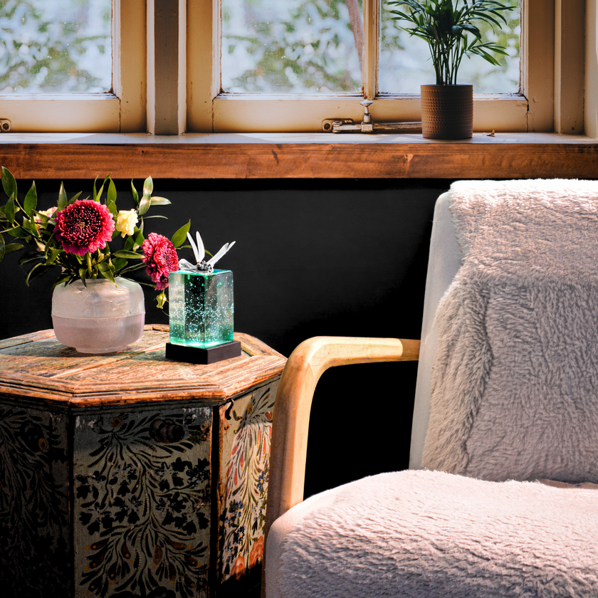 Ez a különleges hangulatlámpa a víz mélységének titokzatos világát idézi meg. Talapzata viaszveszejtéses üvegöntéssel készült. Kézzel csiszolt és polírozott felülete egyszerre tiszta és sejtelmes, mintha egy tó mélyére tekintenénk. Az üveg buborékai apró légzárványokként ragyognak, a természet tökéletlenségének szépségét hordozva.